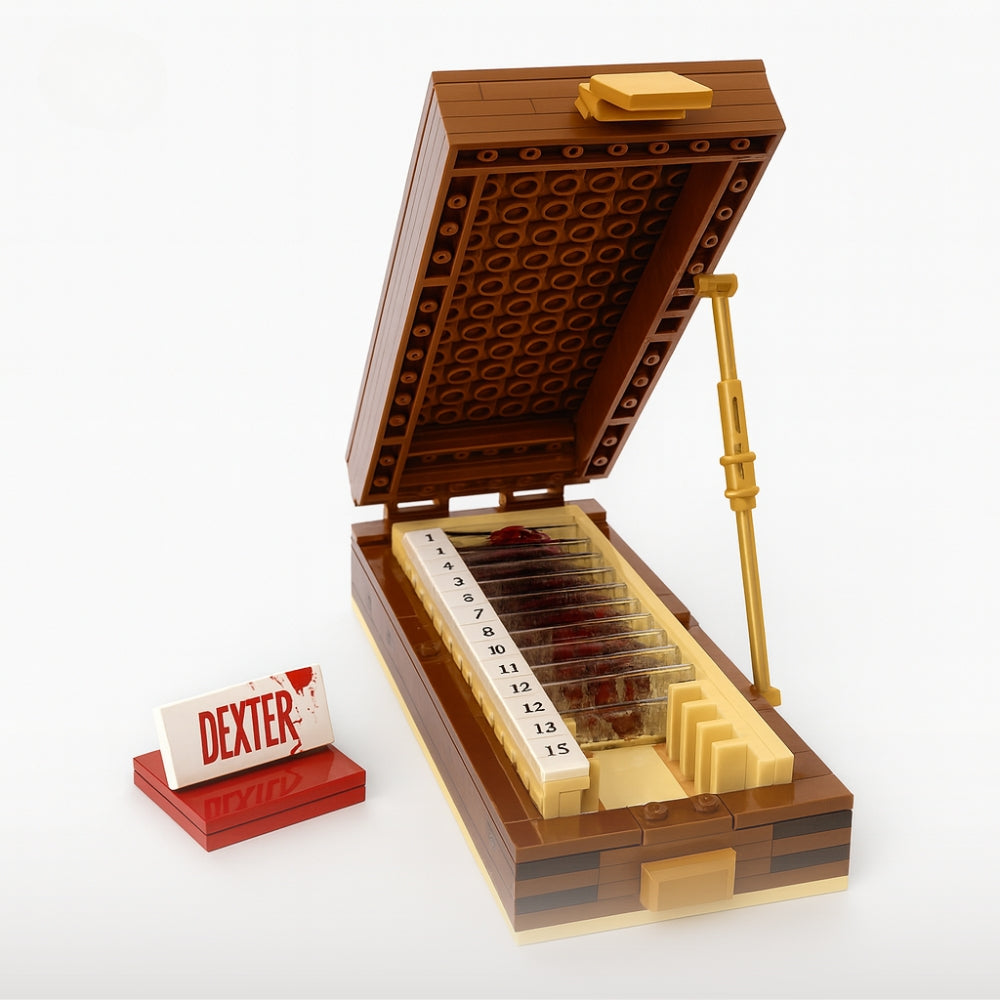 Capture the essence of the Bay Harbor Butcher with this exclusive, meticulously detailed brick replica of Dexter Morgan’s iconic numbered blood slide trophy box and matching nameplate display.