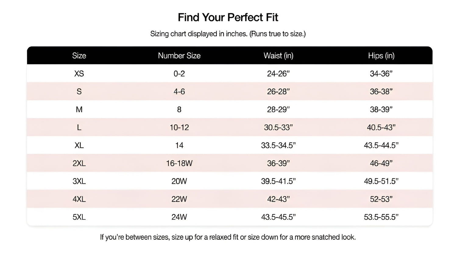 If you’re between sizes, size up for a more relaxed fit or stay true to size for that snatched look.